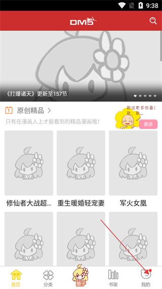 1、进入软件首页,可浏览《打爆诸天》等漫画,还有“原创精品”板块展示等漫画,点击底部【我的】。