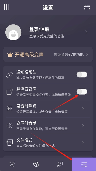 若想在语音聊天时使用变声功能,可点击右下角按钮进入页面,找到“悬浮窗变声”选项并开启。