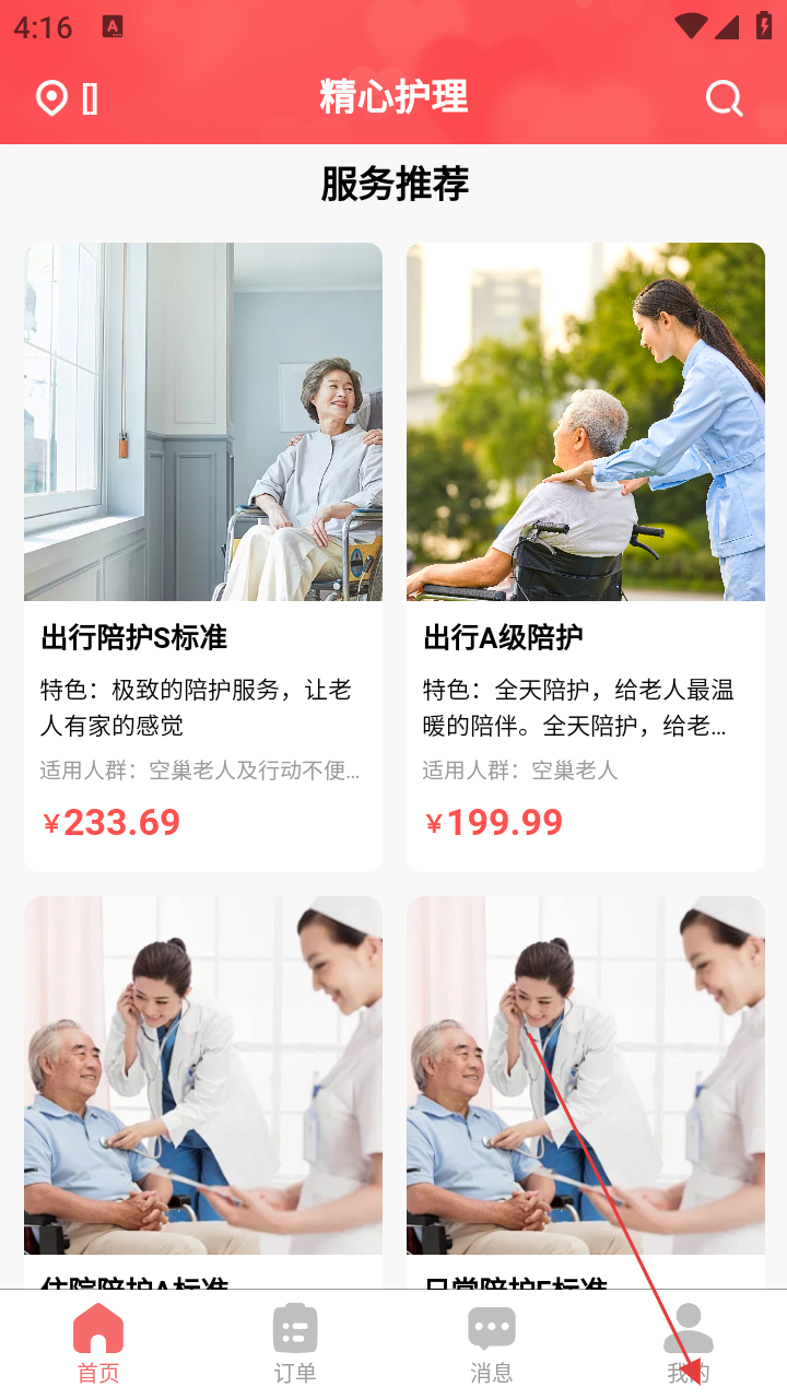 1、打开精心护理,首页有“出行陪护S标准”等服务推荐,可按需查看,若要登录,点击底部【我的】。