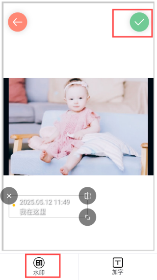 3、添加图片后可通过【水印】等功能编辑,完成后点击右上角【√】保存。