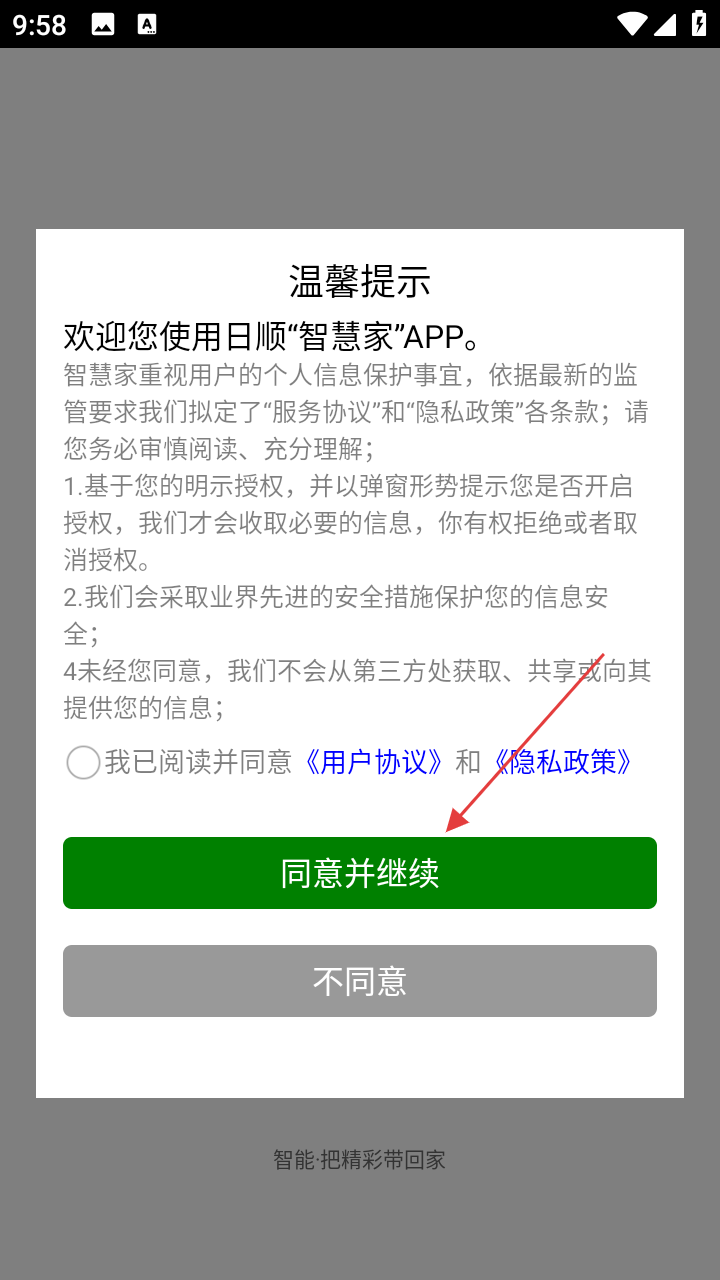 1、打开智慧家,会弹出温馨提示,阅读《用户协议》和《隐私政策》后,勾选同意并点击【同意并继续】。