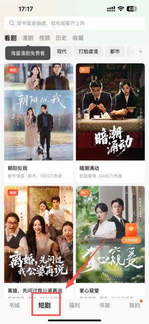 1、打开App首页,浏览热门小说与漫剧推荐。