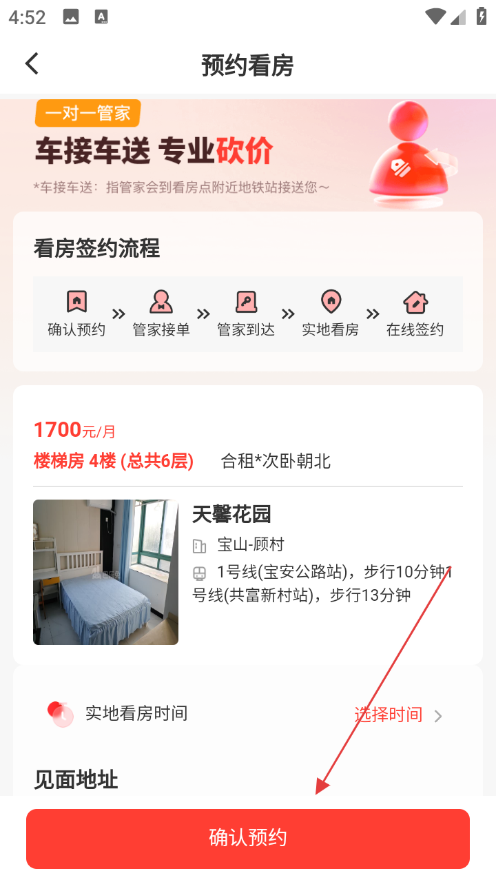 4、选择实地看房时间、确认见面地址,点击【确认预约】,提交看房预约。