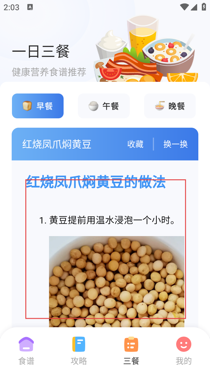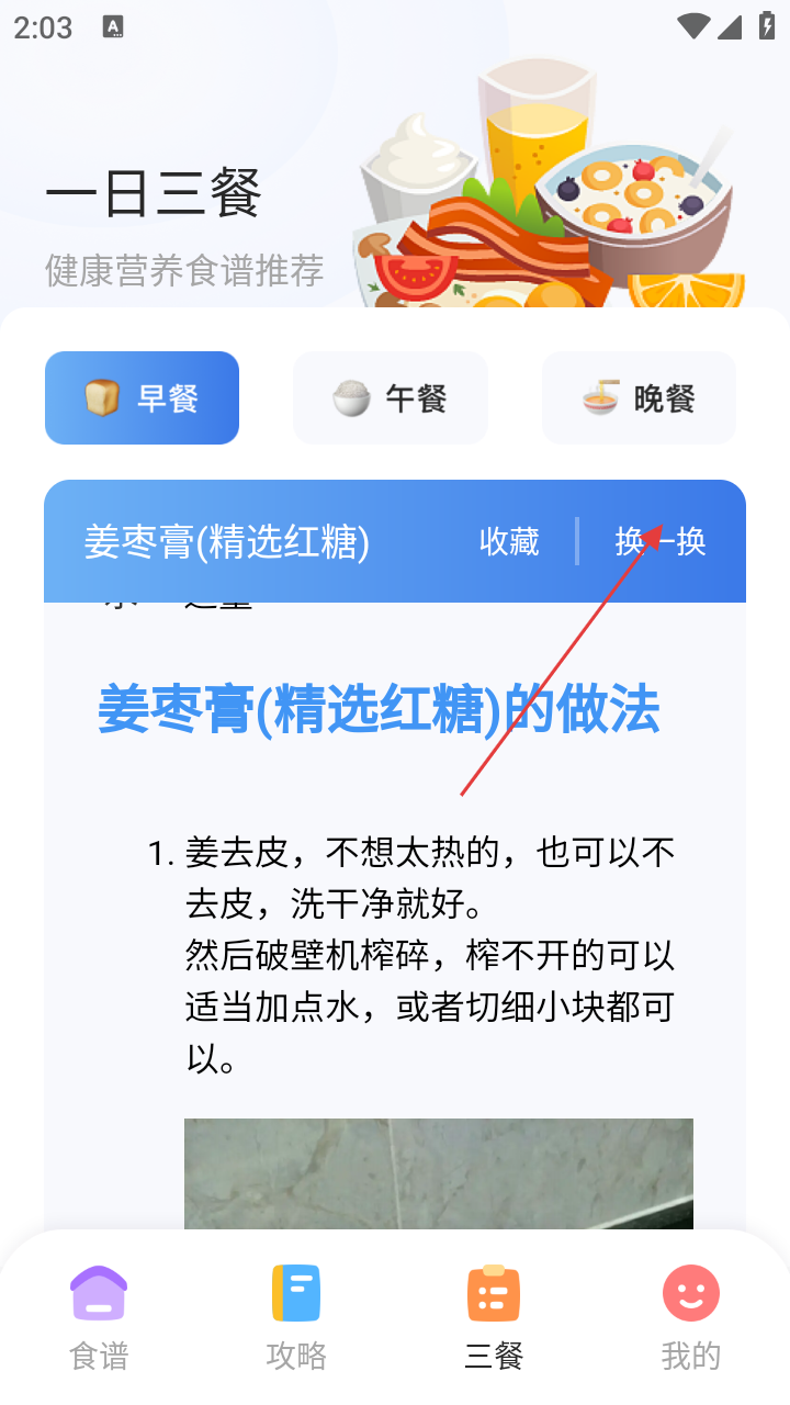 2、进入三餐页面,若对当前推荐的菜谱不满意,可点击【换一换】按钮。