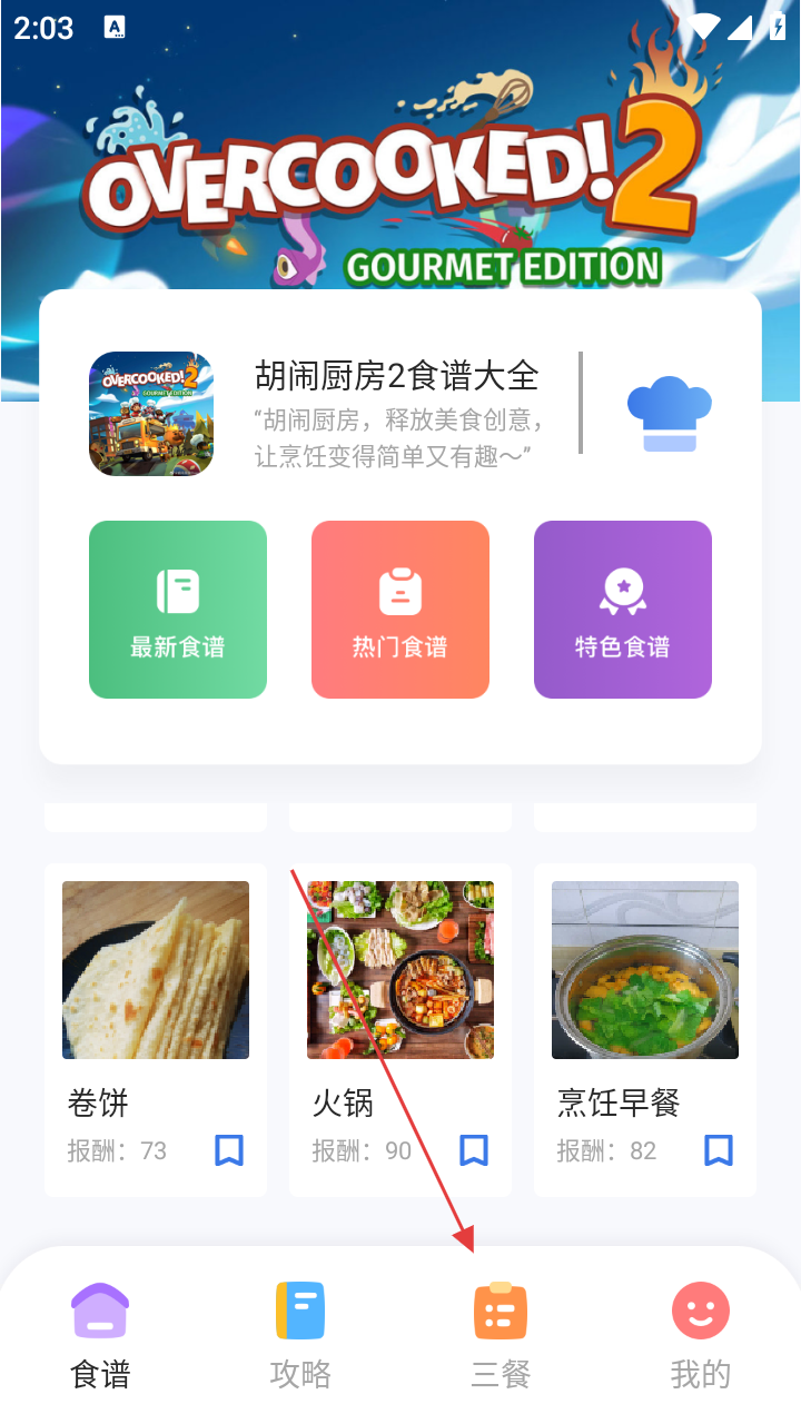 1、打开好油快爆炒,进入好油快爆炒首页,点击底部【三餐】选项。