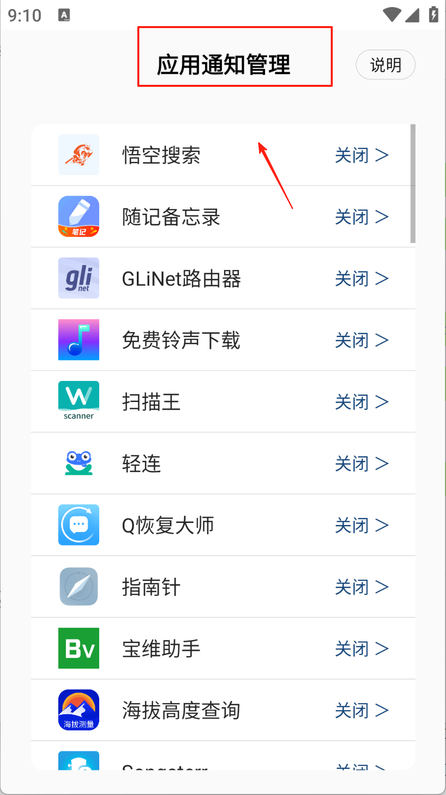 2、在应用通知管理页面,选择需要管理通知的应用,并点击“关闭”或“设置”。