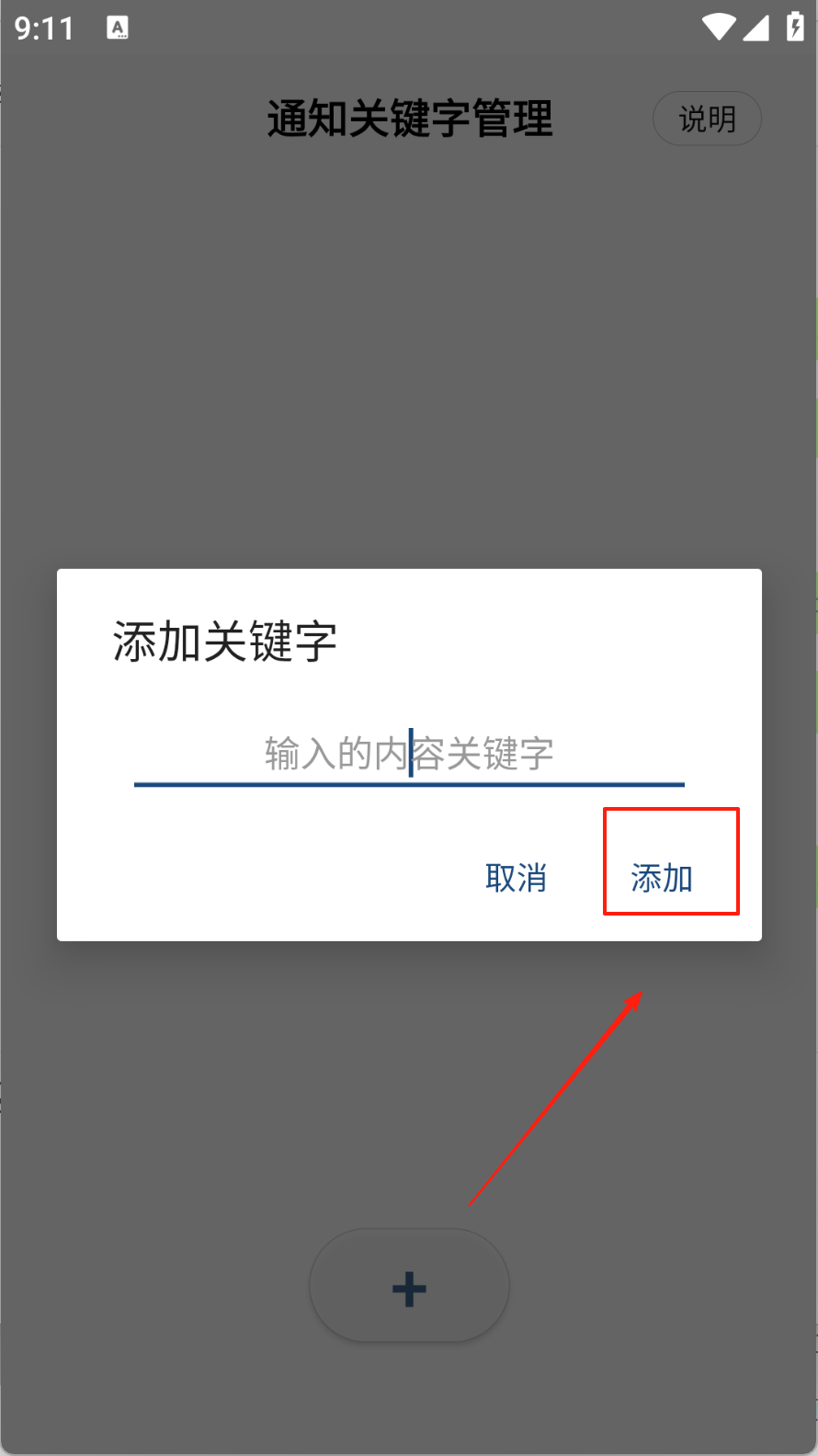 4、在通知关键字管理页面,点击“+”号,输入并添加所需的关键字。