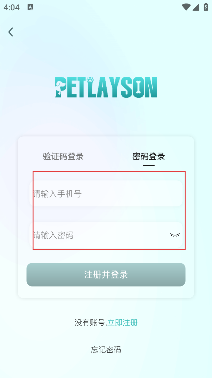 4、进入密码登录界面,输入手机号和密码,点击【注册并登录】即可登录使用应用功能。