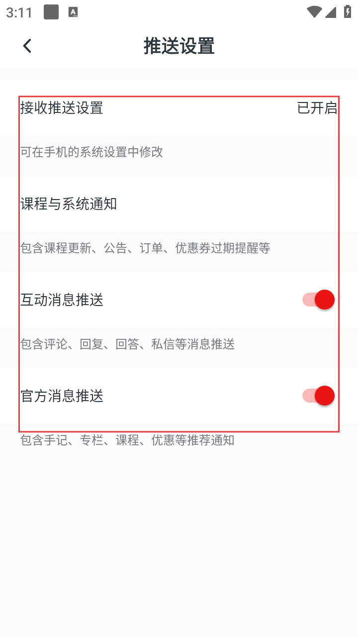 4、在推送设置页面,可设置接收推送、课程与系统通知、互动消息推送、官方消息推送等功能,以便及时获取课程更新、互动消息等通知。