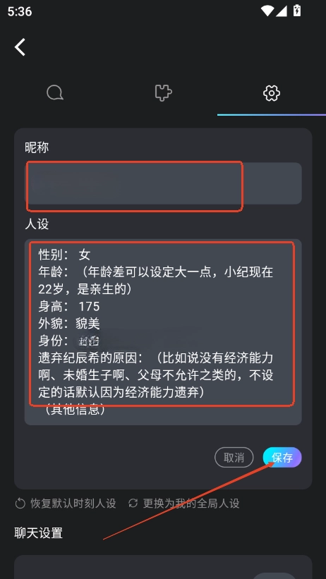 接下来先自定义输入名称、人设等各项参数,完成后点击【保存】按钮就可以了。