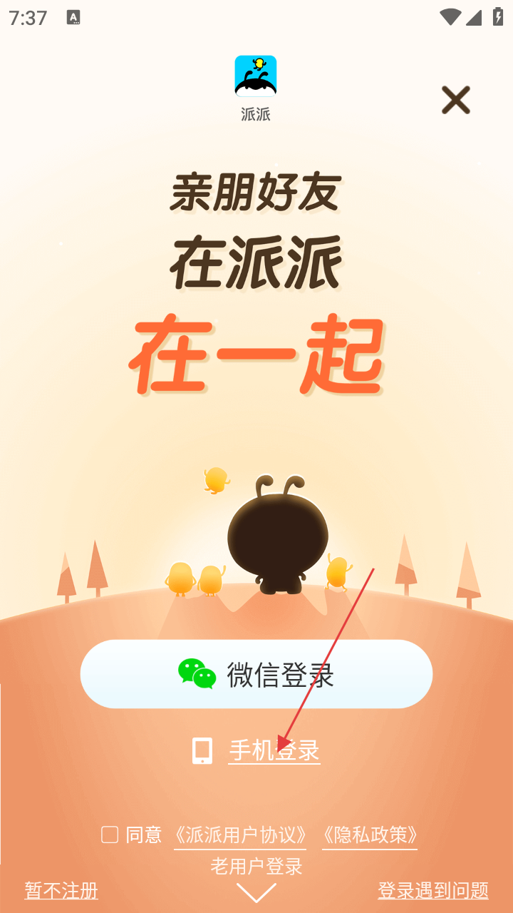 1、首次使用派派,会弹出【用户隐私概要】窗口,仔细阅读后,点击【同意并继续】,进入登录选择页面。