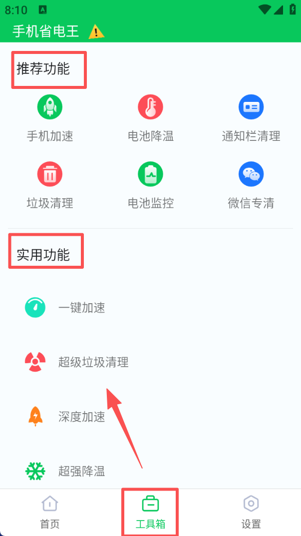 2、点击底部 “工具箱”,能看到推荐功能与实用功能板块,包含一键加速、超级垃圾清理等选项,按需选择对应功能使用。