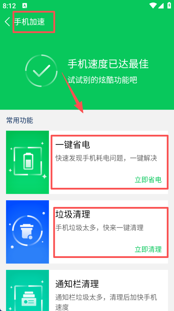 4、在手机加速页面,除了确认设备状态,还能找到一键省电、垃圾清理等常用功能,点击对应按钮即可完成操作。