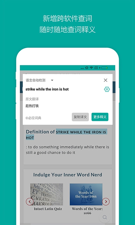 词典内点击查询功能:当你在释义或例句里遇到不认识的单词时,直接点击这个词,它就会自动填入搜索框,省却了手动输入的麻烦。