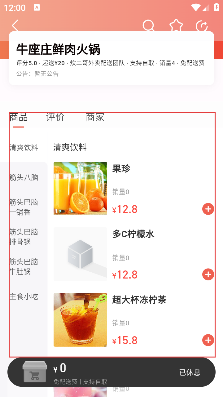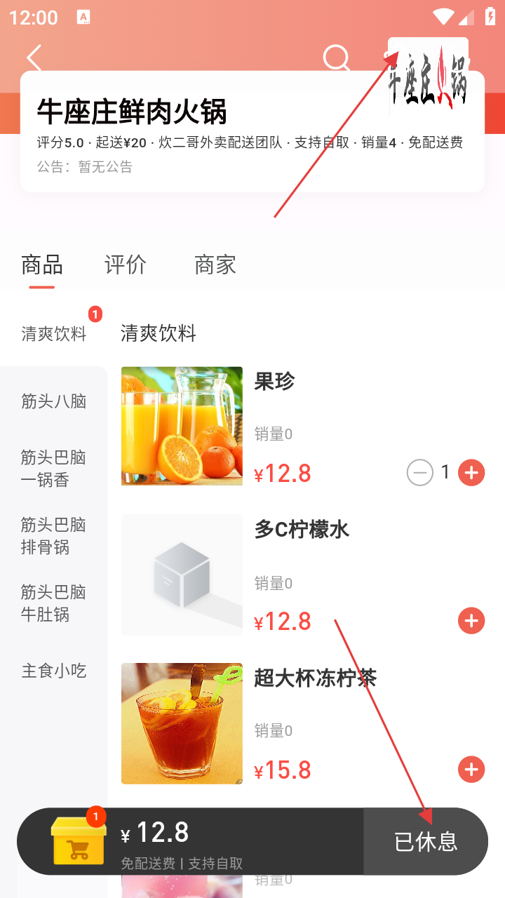 3、进入商家页,在【牛座庄鲜肉火锅】选清爽饮料等品类商品。