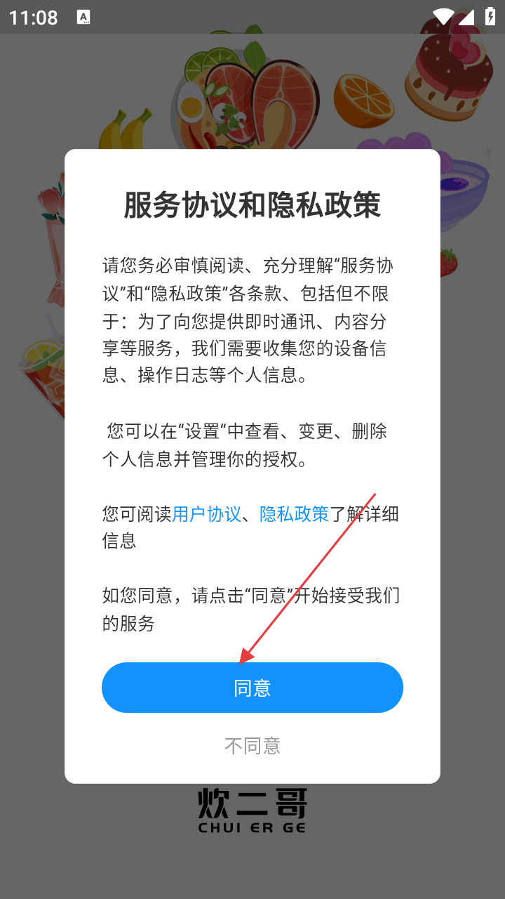 1、打开APP先同意【服务协议和隐私政策】,进入首页开启外卖之旅。