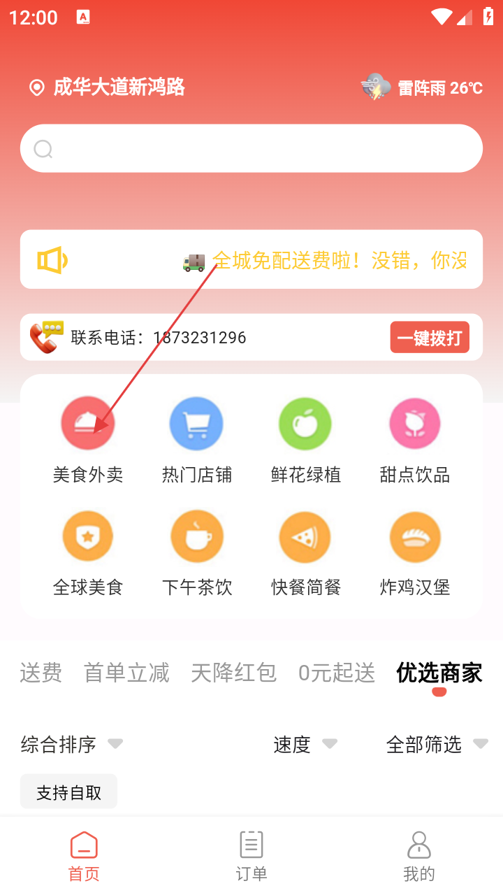 2、在首页选【美食外卖】分类,进入外卖筛选页找心仪商家。