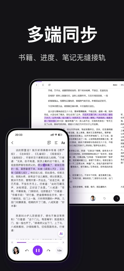 手机端开启阅读,电脑端可继续聆听内容。Readify借助网页界面与Chrome扩展程序,能让您所有设备的阅读进度实现无缝同步。