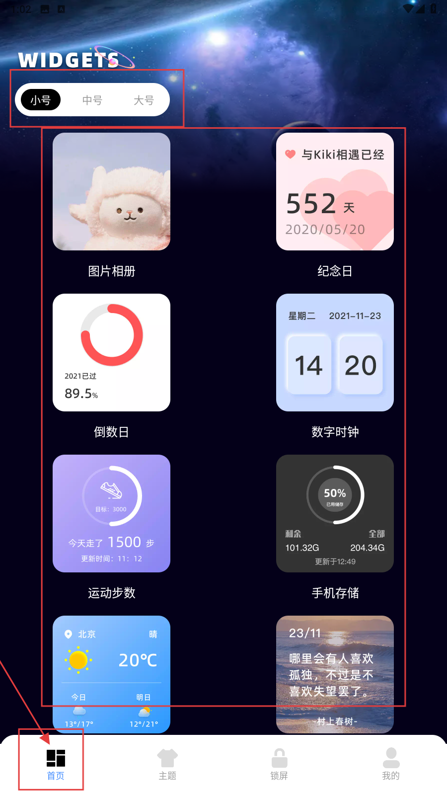 1、打开应用,在首页中可以选择大中小号的组件,选择喜欢的组件并点击。