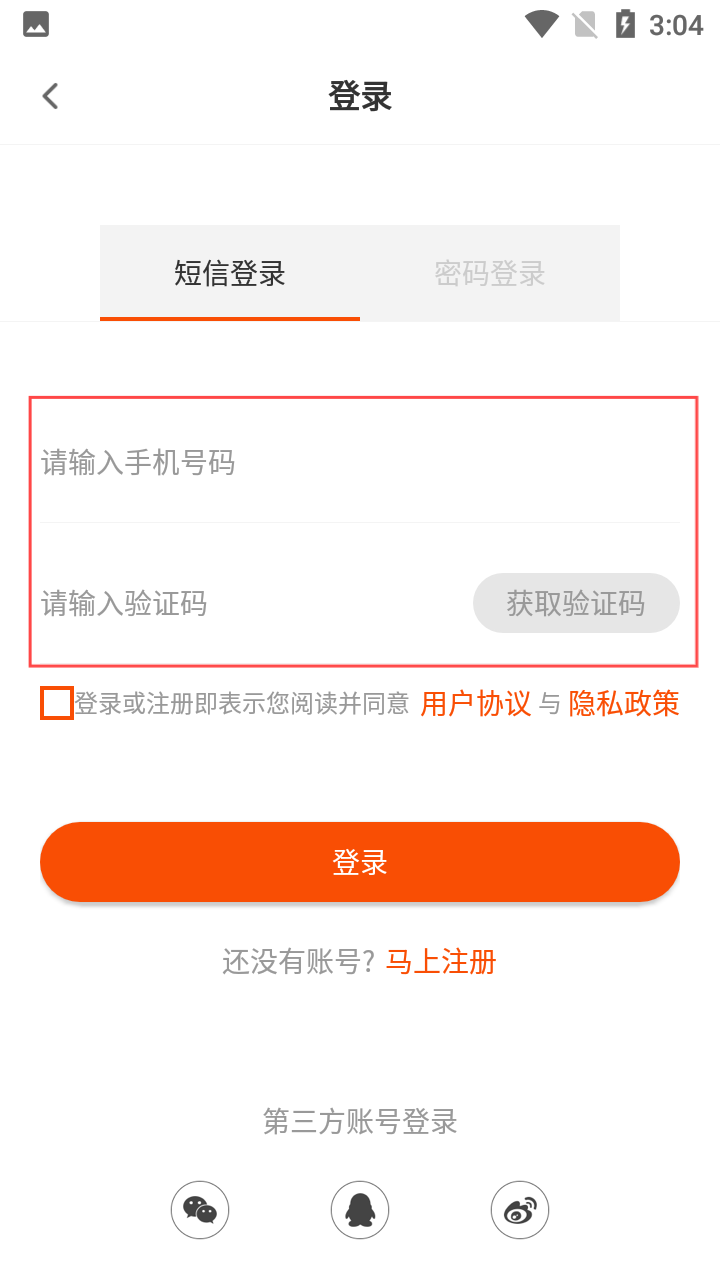3、进入登录页,选【短信登录】,填手机号、验证码,勾选协议点【登录】。