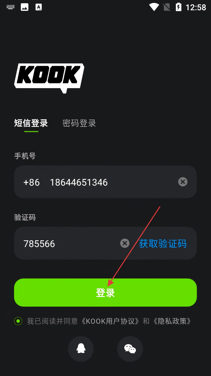 4、输入收到的验证码,勾选“我已阅读并同意《KOOK用户协议》和《隐私政策》”,点击【登录】即可。