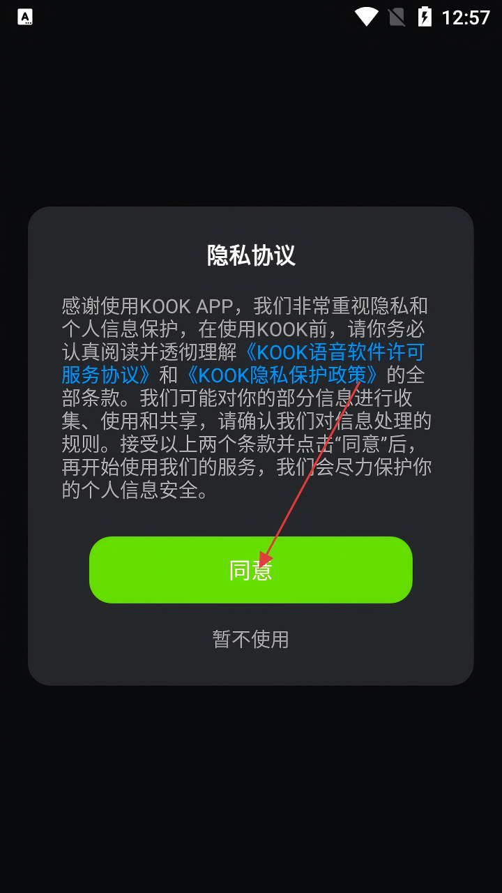 1、打开KOOKAPP,首先会弹出隐私协议提示框,点击【同意】。