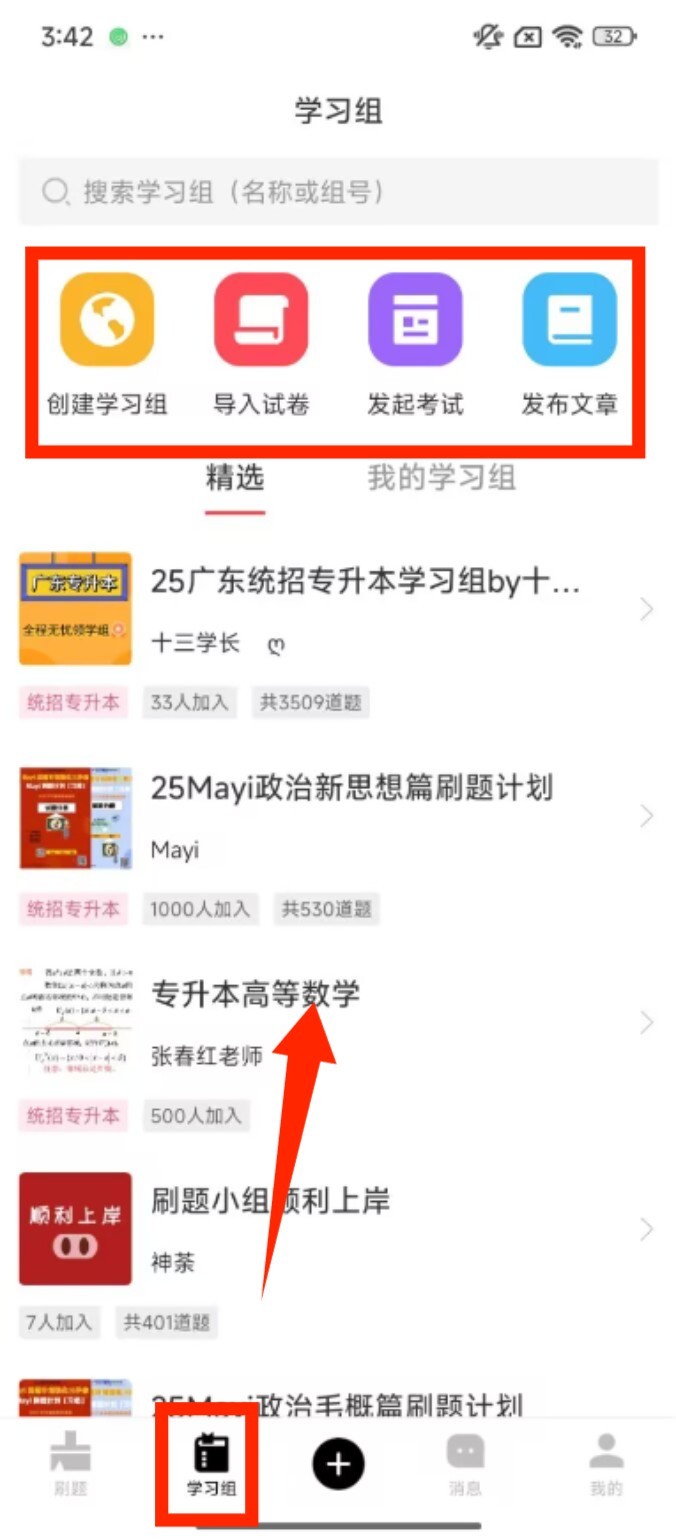 3、点击底部 “学习组” 选项,进入页面后能创建小组、导入试卷,也可加入推荐的精选学习组。