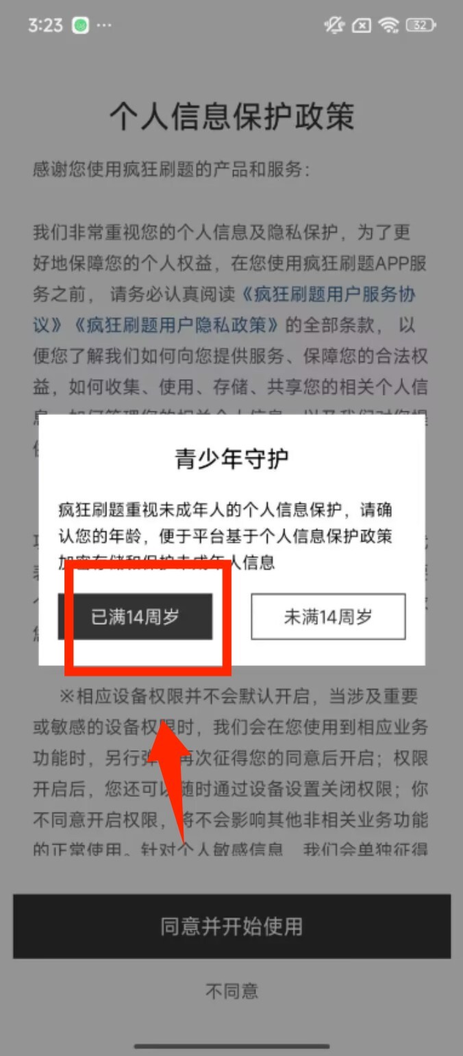 1、进入应用后,在个人信息保护政策页面选择年龄选项,完成青少年守护的身份确认步骤。