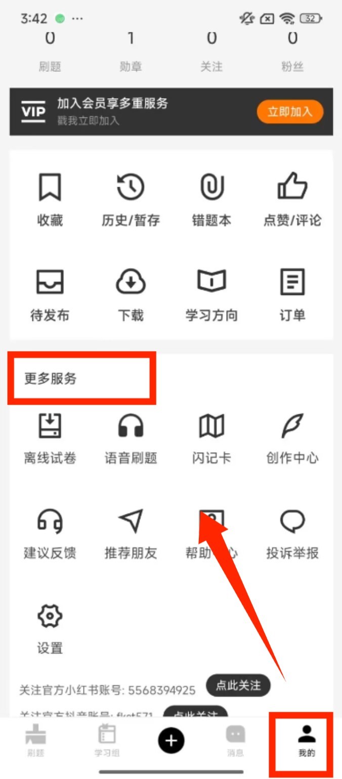 4、切换到 “我的” 页面,在 “更多服务” 区域能找到离线试卷、语音刷题等工具,拓展学习辅助方式。