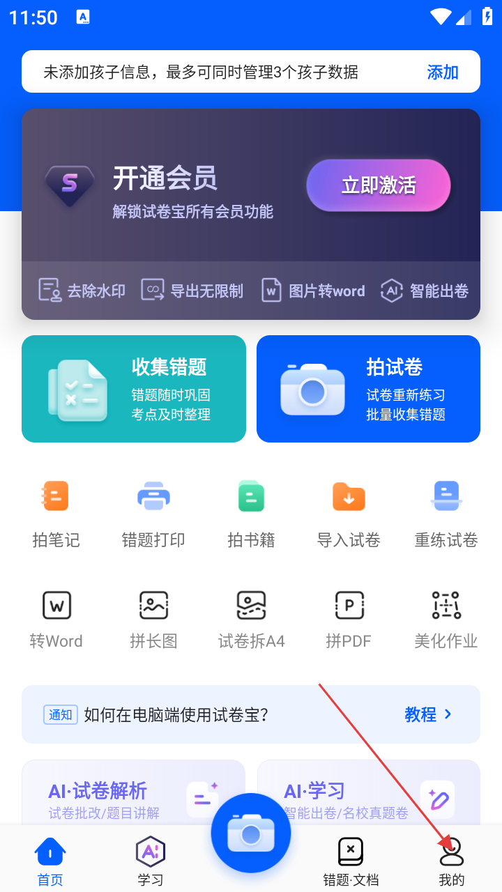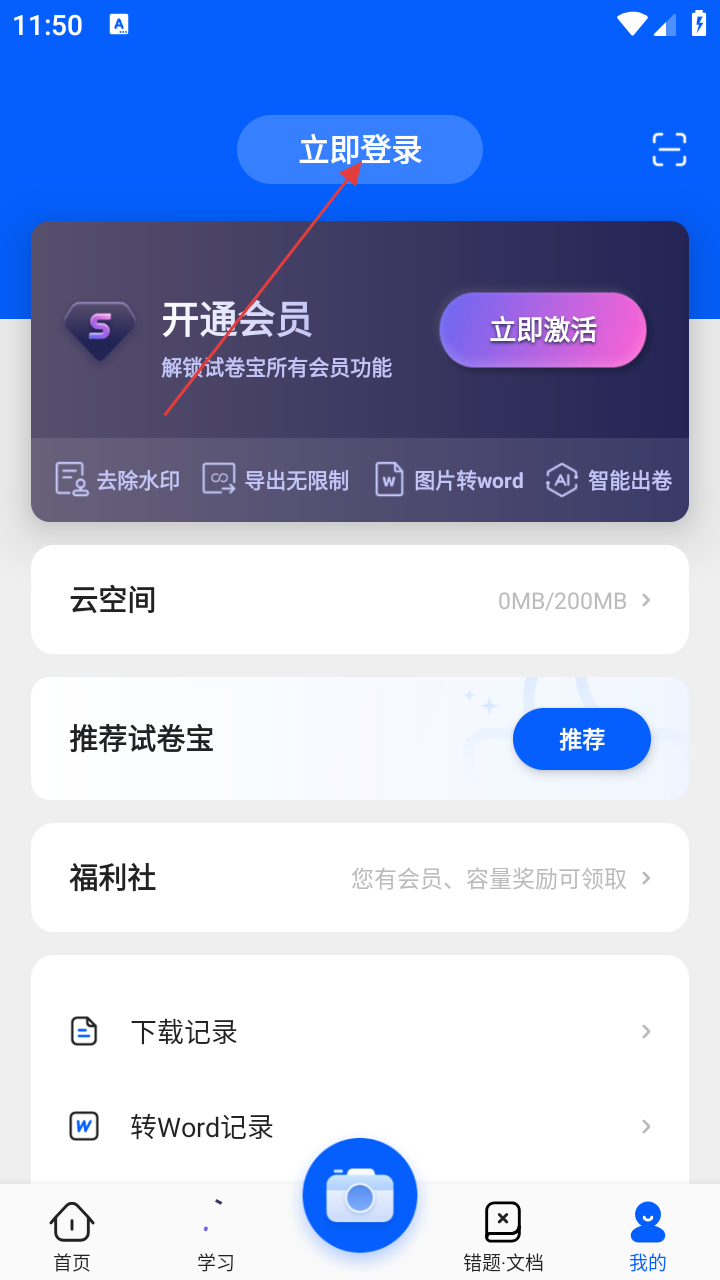 1、在试卷宝首页,点击右下角【我的】选项,进入个人相关页面,可进行登录等操作。