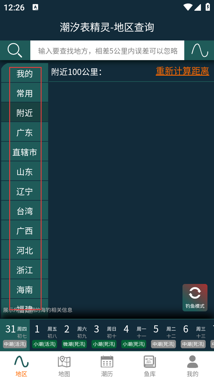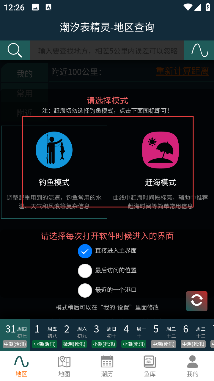 1、打开【潮汐表精灵】,选【钓鱼/赶海模式】,设置启动界面。