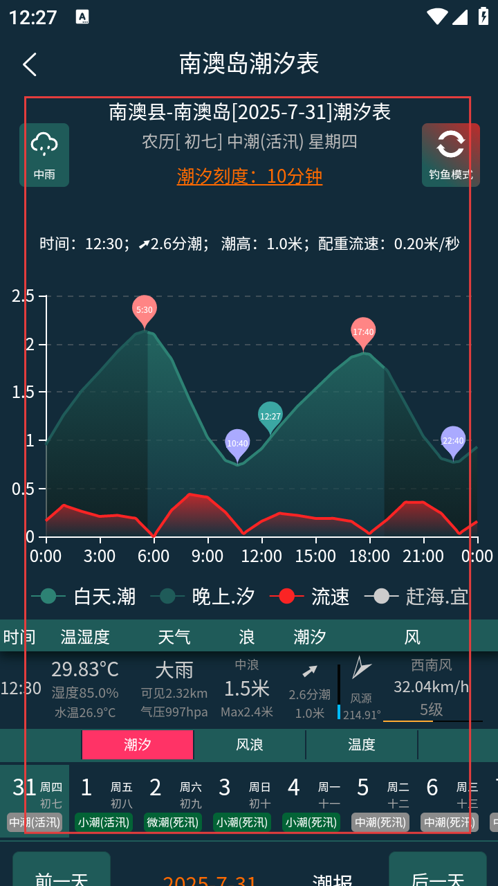 4、点进钓点看潮汐表,依据潮高、流速等数据,规划钓鱼/赶海行程。
