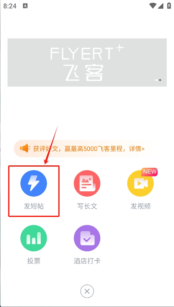 3、在发布内容页面,点击“发短帖”图标,快速分享你的旅行见闻或提问。