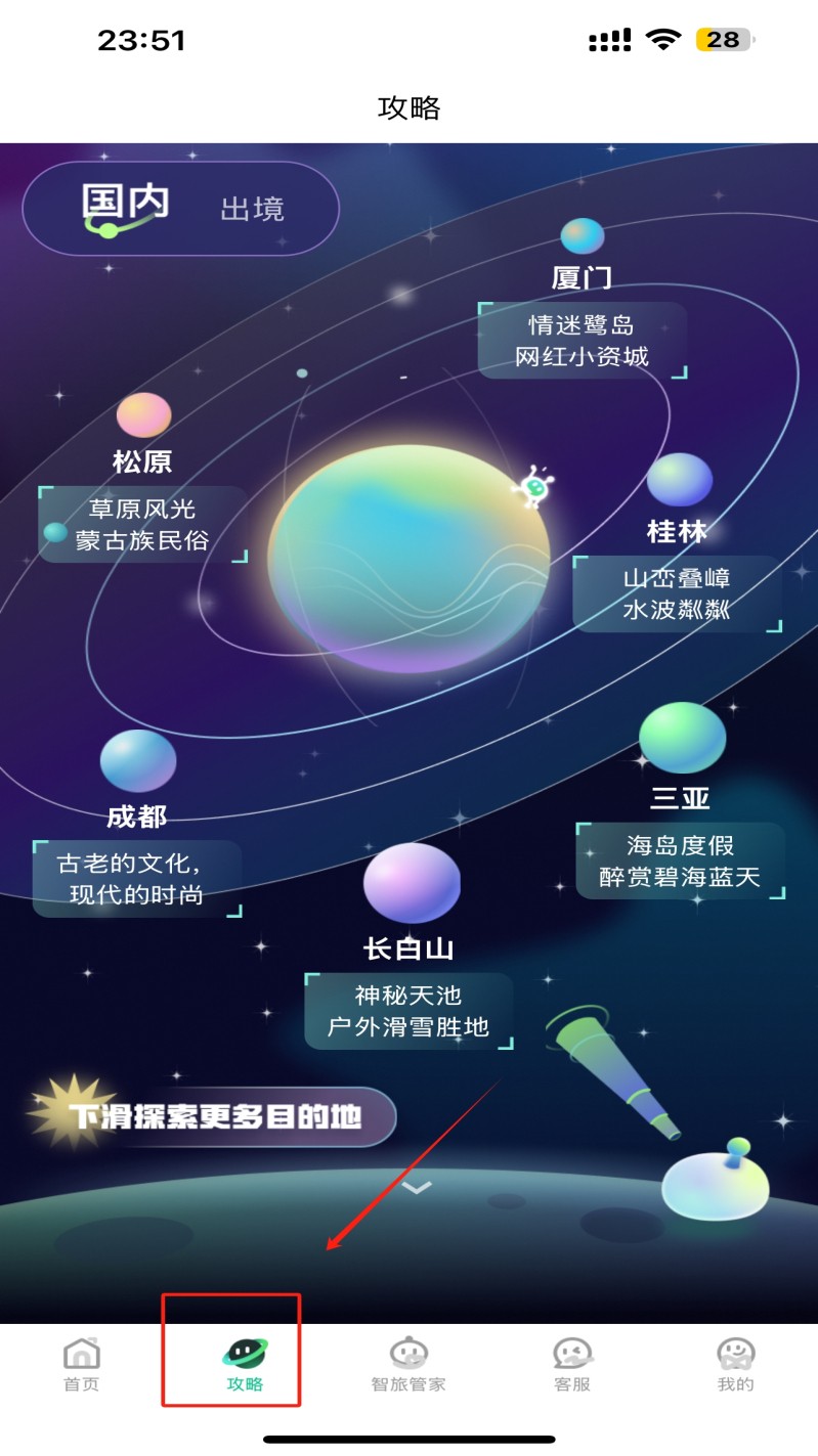 1、选择旅游目的地:在首页,点击不同目的地图标选择旅游地点。