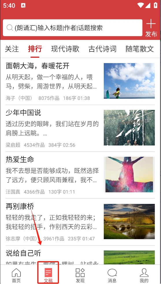 3、点击“文稿”按钮,用户可以查看并选择不同的诗歌作品进行朗诵或创作。