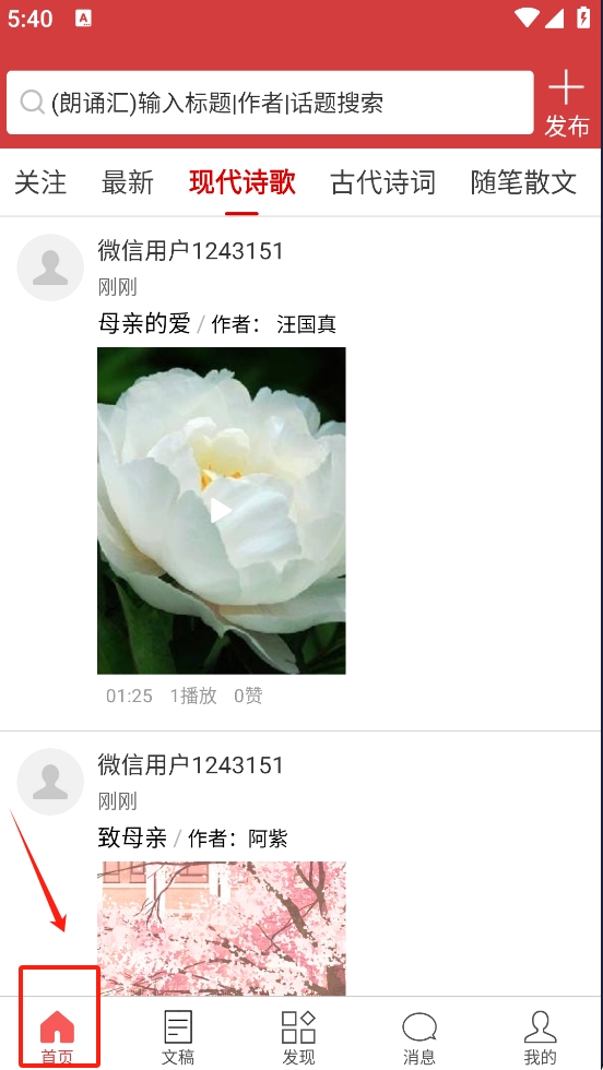 2、进入首页,用户可以通过搜索栏输入标题或话题进行搜索,浏览最新的现代诗歌内容。