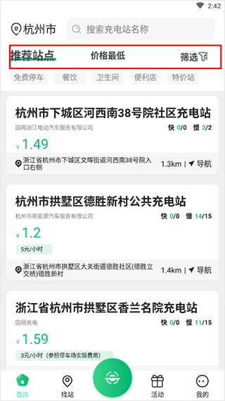 借助筛选功能,挑选出距离最近或者价格最低的充电站点。