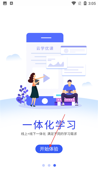 2、点击“开始体验”,进入应用的功能引导环节,了解其“线上+线下一体化”的学习服务模式。