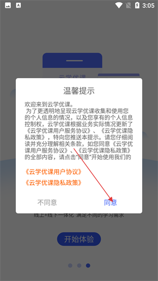 1、阅读《云学优课用户服务协议》《云学优课隐私政策》后,点击“同意”按钮,确认相关条款。