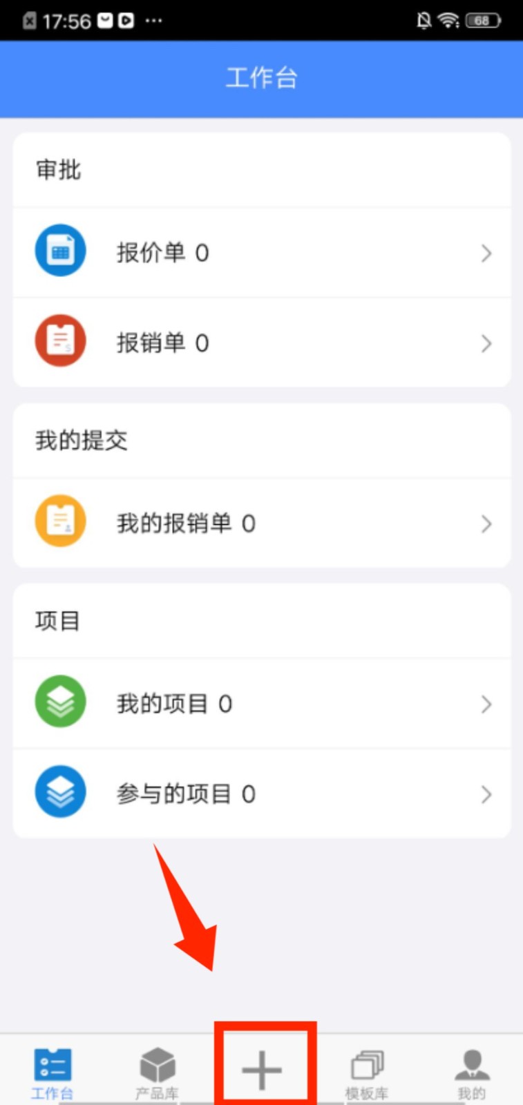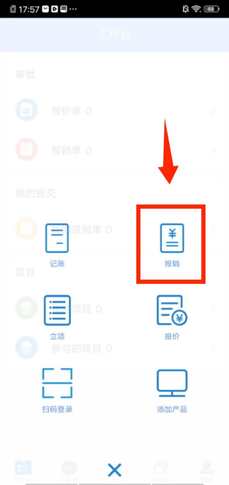 1、进入工作台页面,点击底部中间的加号按钮,在弹出的功能栏里找到 “报销” 选项并点击进入。