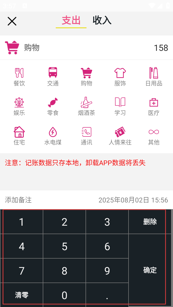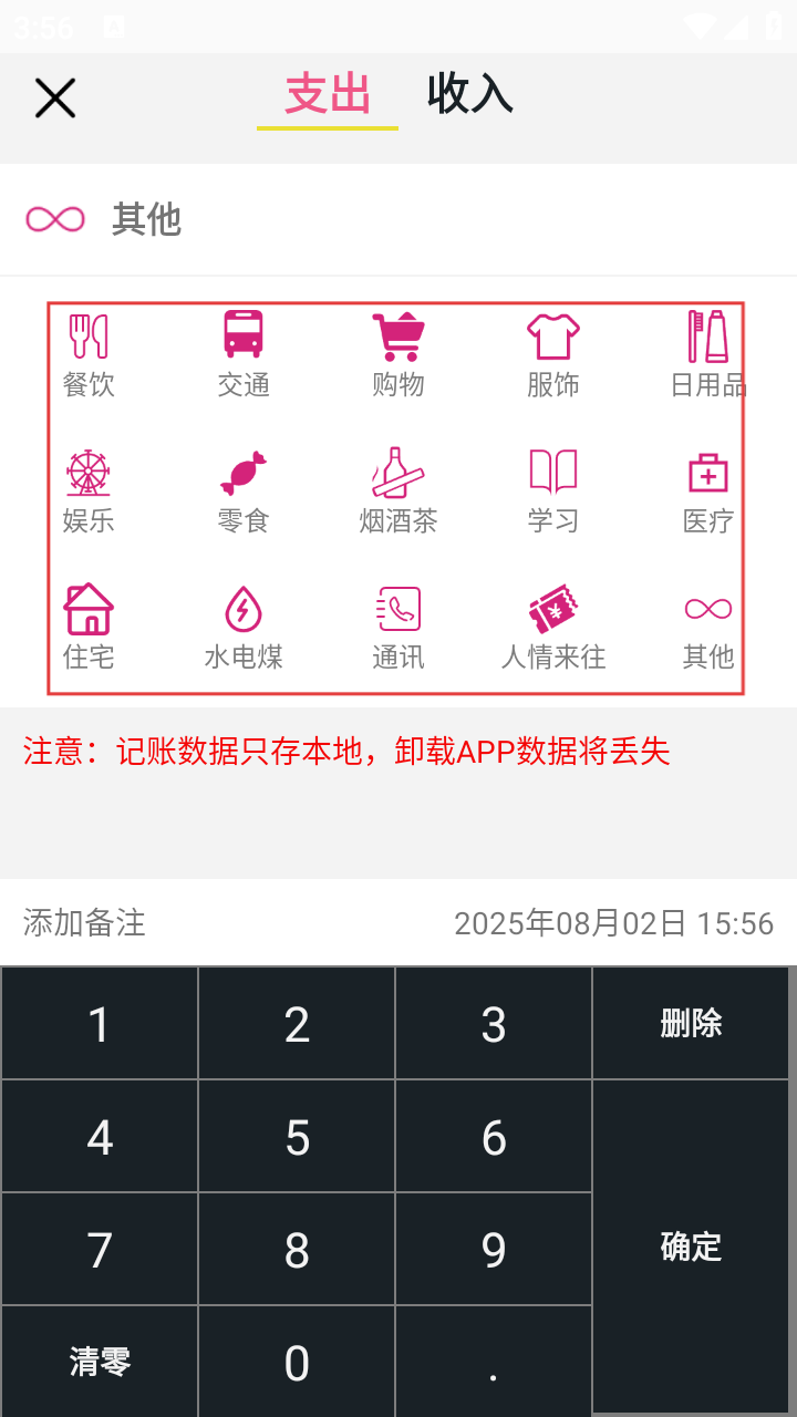 2、在收支页,选择对应类别,进入金额填写。