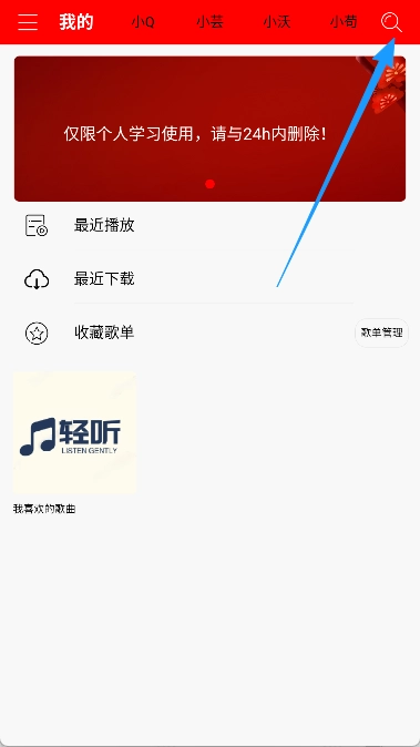 在手机上启动轻听音乐2026应用,接着点击界面右上角的搜索图标。