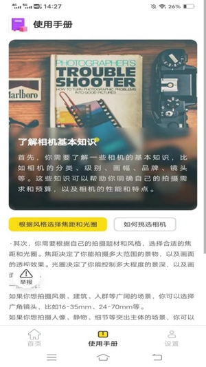 3、丰富的相机知识库,帮助用户深入了解相机使用技巧。