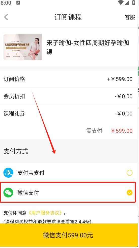 4、选择微信支付作为支付方式,完成课程订阅。