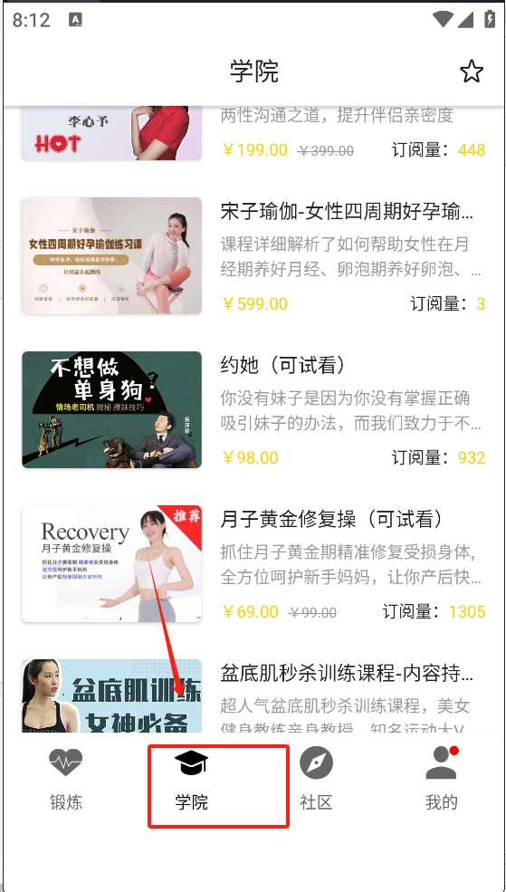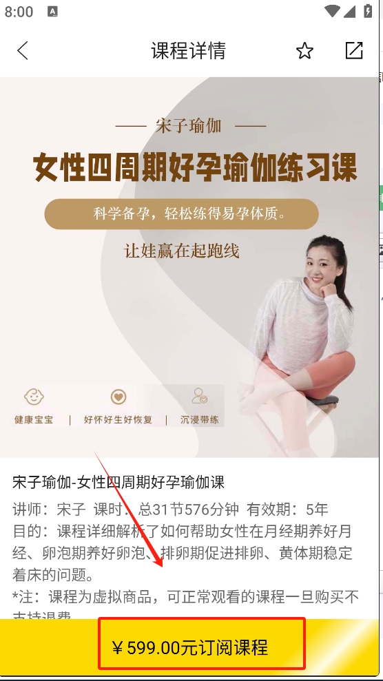 2、在学院页面中搜索并找到感兴趣的瑜伽课程,确认课程价格及订阅信息。