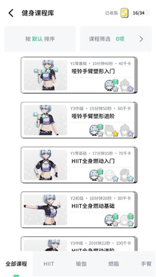点击健身板块,这里的健身课程十分丰富多样,涵盖了全身燃动、瑜伽、燃脂、手臂训练、增肌、塑形、拉伸放松、疾速燃脂以及拳击等多种类型。而且每个课程都设置了不同难度等级,从适合零基础的y1级别,一直到挑战突破的y5级别,能满足不同阶段的健身需求。
