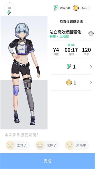 训练结束后,教练也会给予夸奖,称赞你表现出色,还能查看本次训练所消耗的时间、难度等级以及卡路里数量。