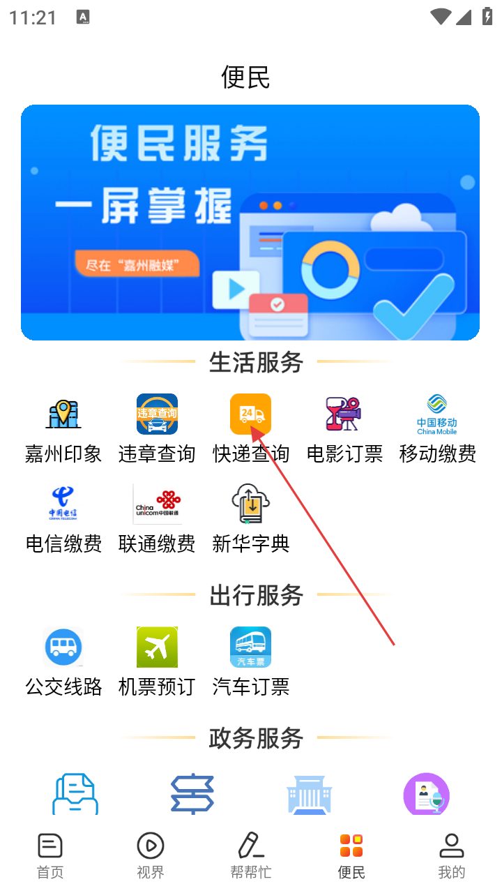 1、打开嘉州融媒进入应用首页面,点击底部【便民】。