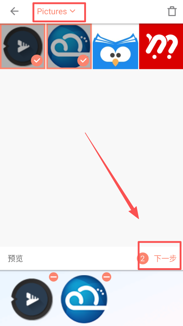 2、进入拼接页面,从相册中选取需要组合的图片,勾选后点击 “下一步” 进入编辑环节。