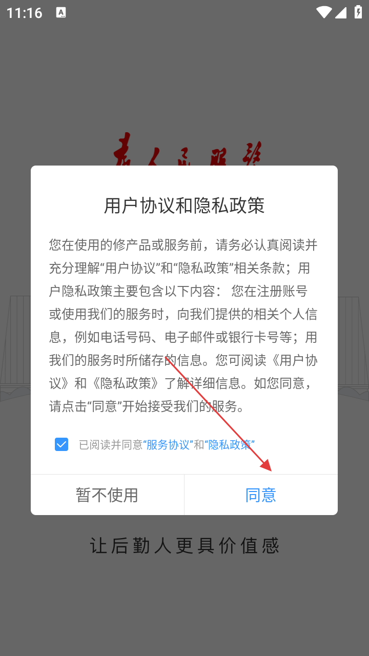 1、勾选【已阅读并同意服务协议和隐私政策】,点击【同意】,进入注册登录环节。